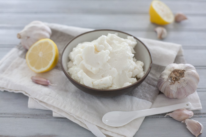 Chop garlic and salt in a blender. With the motor running slowly add 1 tbsp of lemon juice oil water and remainder of lemon juice very slowly until all the liquid is incorporated to make a thick white paste.